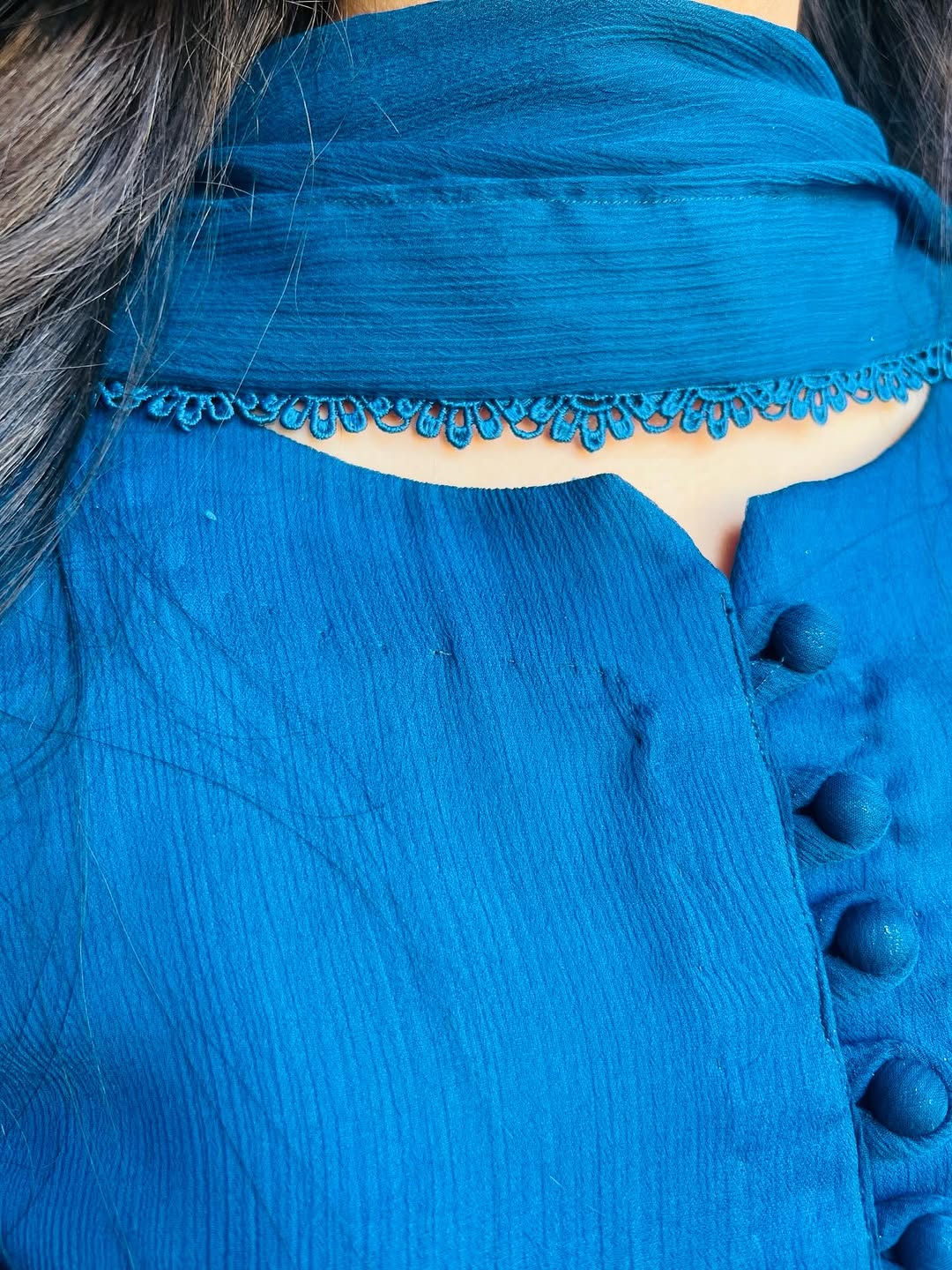 This elegant 3-piece chiffon anarkali style dress features a full flair, adding a graceful touch to your look. The dress is adorned with delicate lace work on the flair and intricate double-coated shuttle less lace work on the sleeves and neck. It comes with a chiffon dupatta featuring lace work on all four sides. The dress is completed with an atal inner lining for comfort and grip trousers.