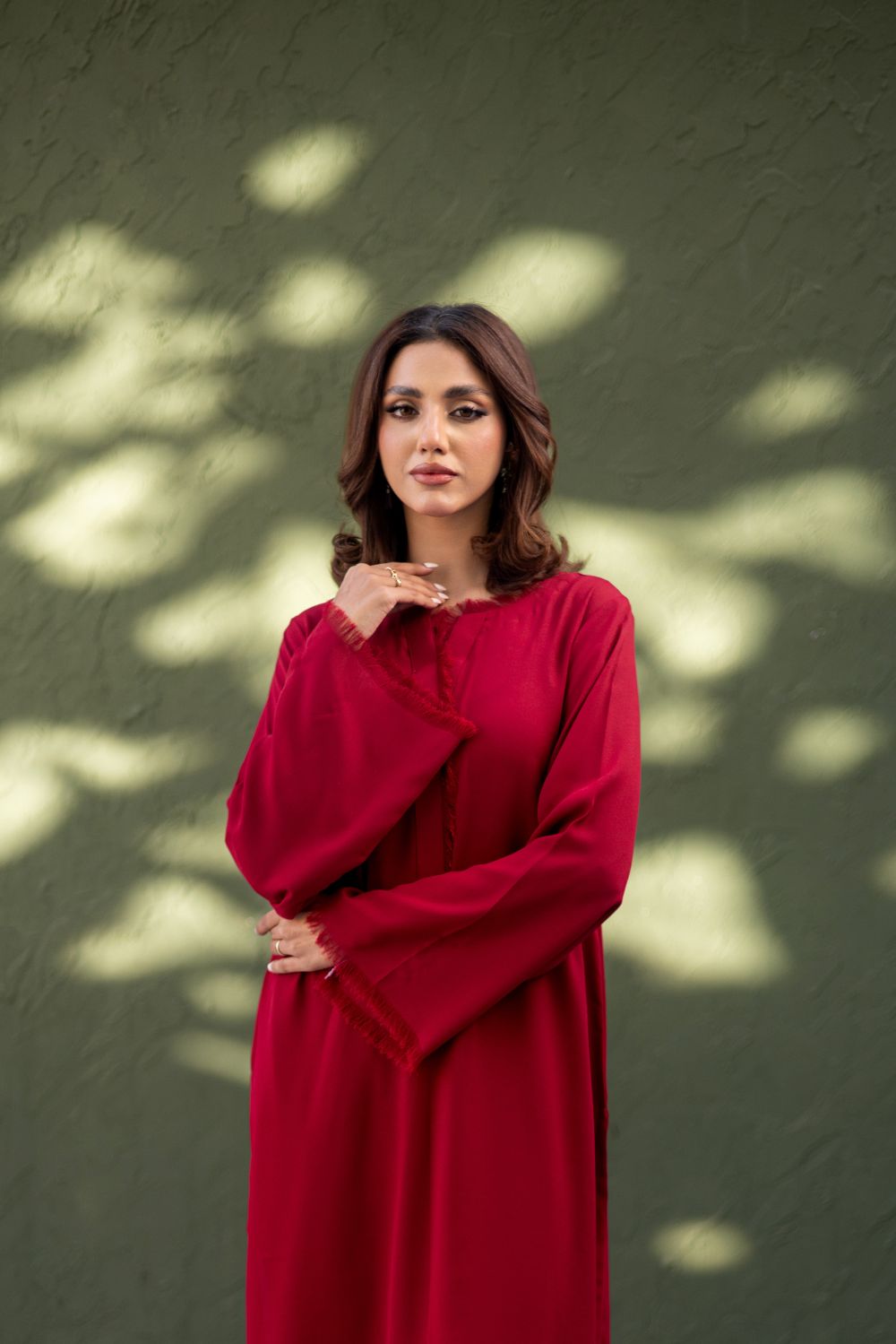Straight shirt with fringe details on neckline, sleeves, and daman, straight full sleeves, plain back and palazzo pants with fringe details.