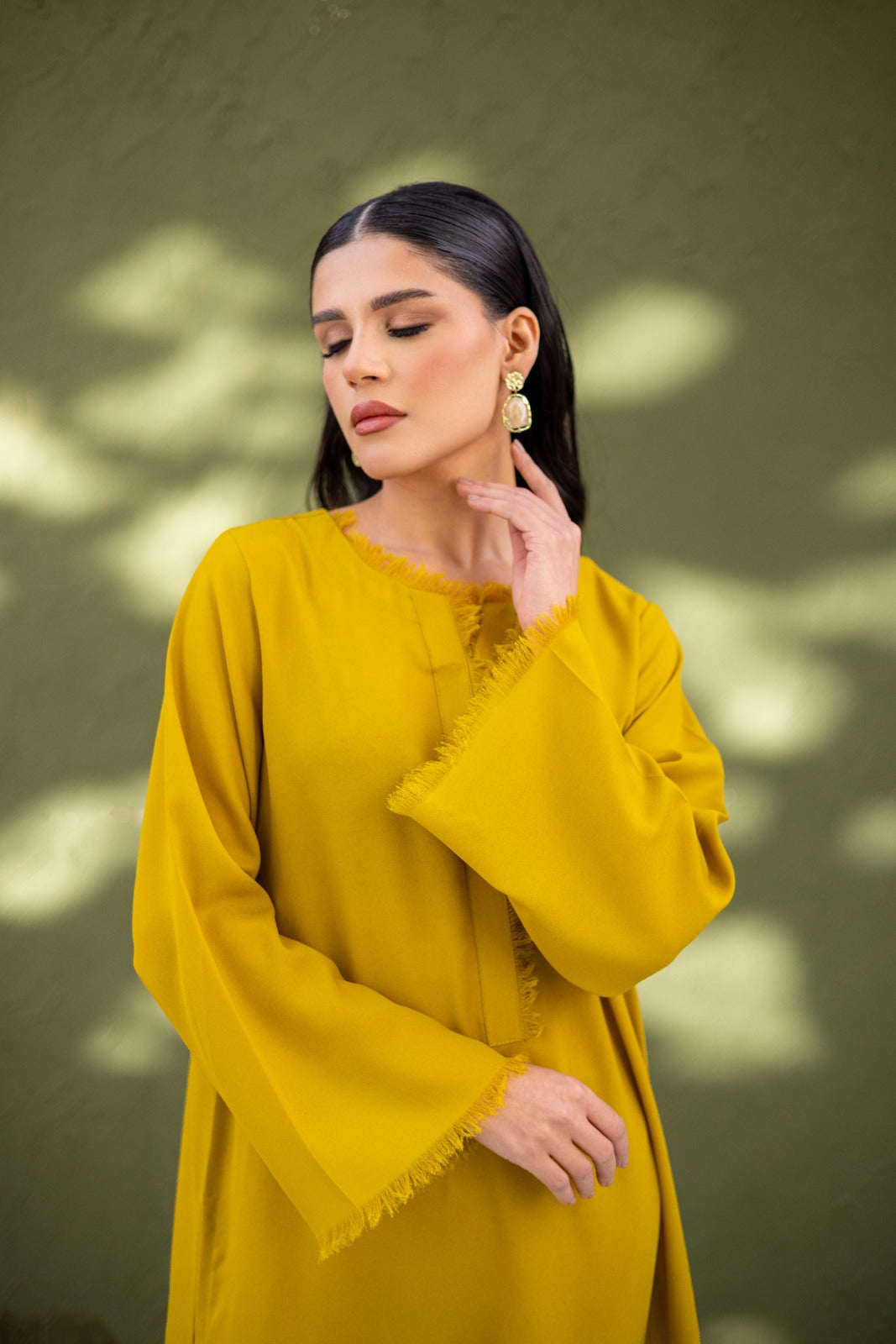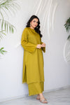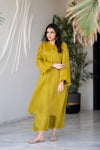 Straight shirt with fringe details on neckline, sleeves, and daman, straight full sleeves, plain back and palazzo pants with fringe details.